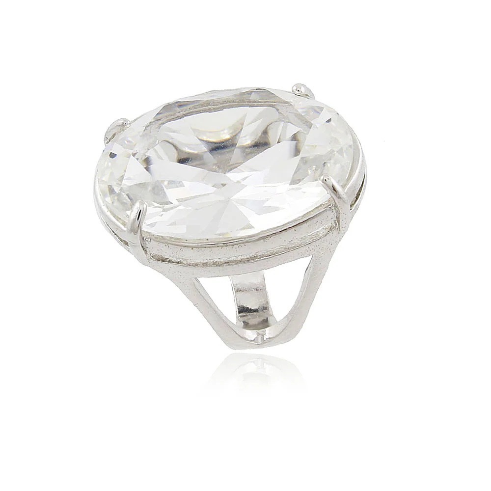 Anel Oval de Cristal Grande com Banho de Ródio Branco – Tamanho 18